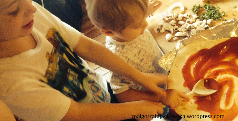 Robienie pizzy na cztery ręce to spore wyzwanie, szczególnie jeżeli wszystkie cztery ręce chcą trzymać tę samą łyżkę ale i tak się nam udało. Nie przeszkodziła nawet awaria prądu a więc i piekarnika (nie dorobiliśmy się jeszcze pieca węglowego w naszym mieszkaniu, za to mamy kamień do pizzy od Jamiego Olivera 😀 ).