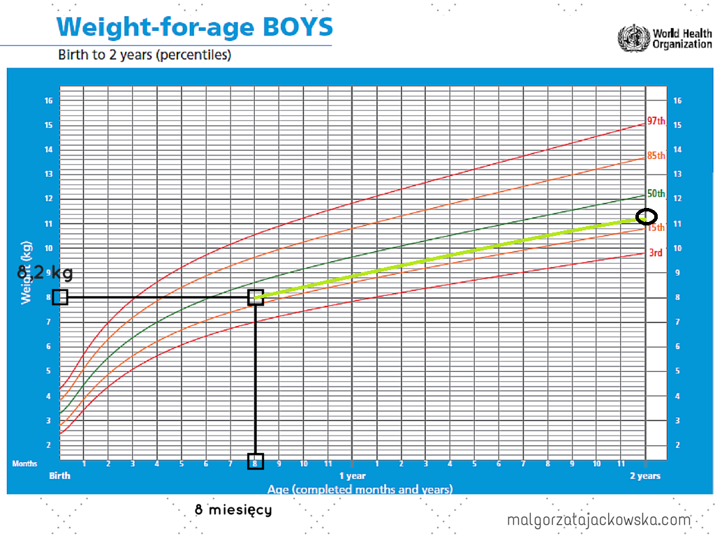 Na pewno nie to, że jest za chude i trzeba je utuczyć. Oznacza to, że biorąc pod uwagę ogół populacji dzieci (na podstawie której powstała siatka) w jego wieku, 15 % dzieci jest od niego lżejszych a 85% cięższych.